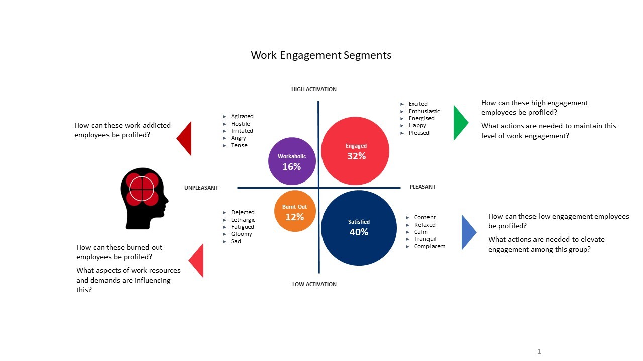 Those below the benchmark are classified as low engagement, unless validated scales indicate burnout or workaholism, in which case they are placed into those specific segments.